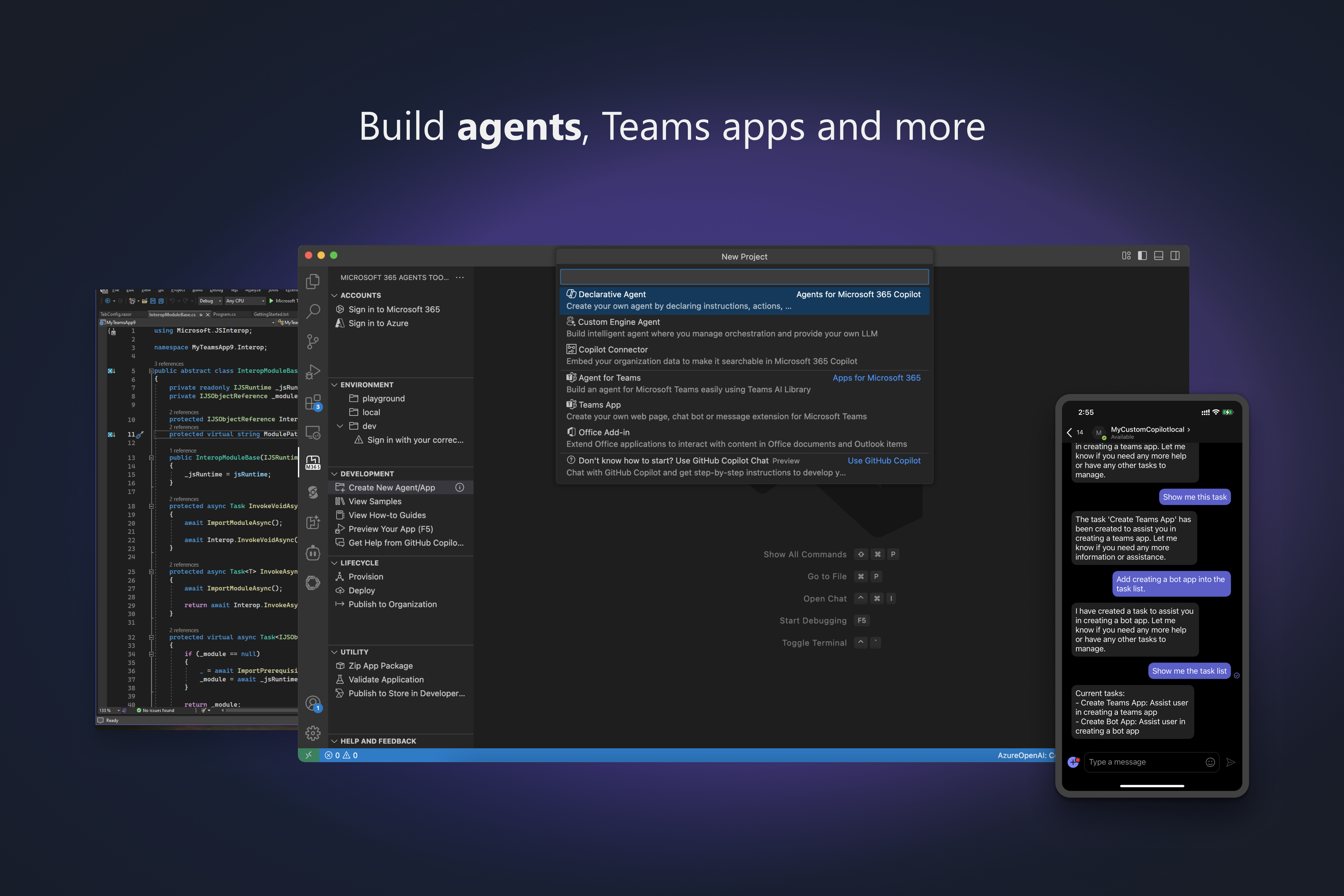 Declarative agents, custom engine agents, Teams bots, tabs, message extensions, Office Add-ins, and Copilot connectors — in TypeScript, JavaScript, Python, and C#.